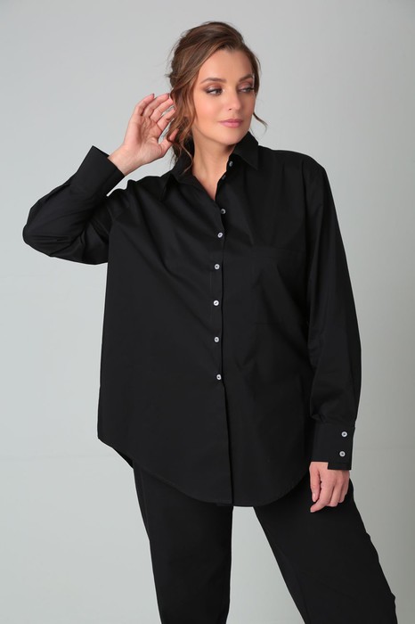 Рубашка прямого силуэта подходит под любые формы и типы фигуры. На левой полочке расположен карман. По спинке имеется кокетка с пришивными пуговицами чёрного цвета. Эффектный образ создается за счет необычных деталей и элементов. Ассиметричные манжеты и чёрные пуговицы фишка этой рубашки. Белая рубашка– это не только стильно, но и эффектно, а ещё и удобно. Прямой силуэт, который стройнит и белый цвет сочетается со всей палитрой одинаково классно. Добавляем эту рубашку к любому “низу” образ готов. Модель OverSize. Длина по переду 79 см. Длина рукава от воротника 75 см. Длина по спинке от воротника 79 см.