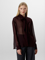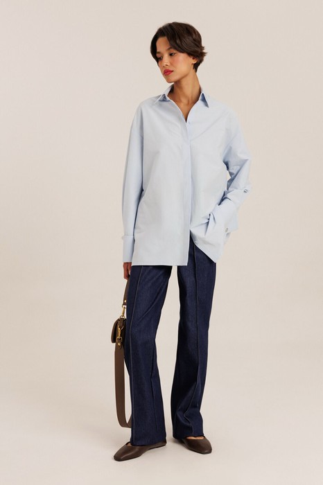 Блузка женская "оверсайз" прямого силуэта. Воротник отложной на стойке. Рукав спущенный с притачной широкой манжетой с отворотом. Разрез рукава обработан планкой. Застежка по переду потайная, на пробивные петли и пришивные пуговицы. Дизайнерская вышивка на воротнике.