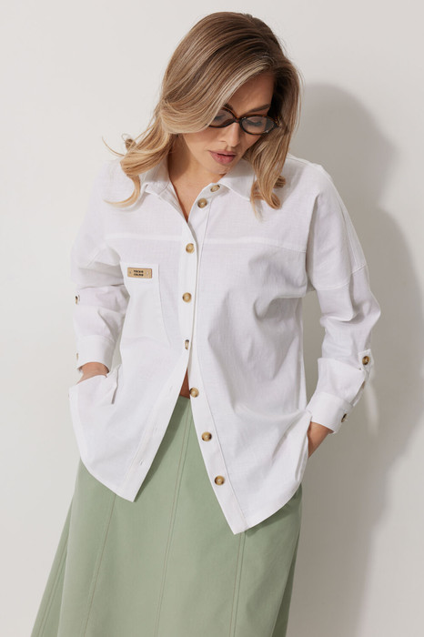 Блузка женская с рукавом и спущенной линией плеча длиной за линию бедра. По переду блузки обработана отрезная кокетка. Накладной карман расположен правой части полочки с декоративным элементом. По спинке блузки обработана отрезная кокетка. Рукав втачной рубашечный одношовный.  Низ рукава со складкой, обработан притачной разъемной манжетой, застегивающаяся на петлю и пуговицу. В разрезе рукава пришита пата, застегивающаяся на пуговицу. Перед блузки обработан отрезными планками, застегивающимися на петли и декоративные пуговицы. Горловина обработана рубашечным воротником со стойкой. Подгибка низа блузки 1,5 см. По боковым швам блузки обработаны разрезы.