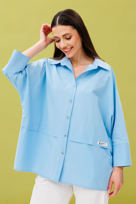 Блуза рубашечного покроя с объемом oversize со спущенной линией плеча «а-ля летучая мышь». Спинка состоит из горизонтальной кокетки и основной детали, по центру с бантовой складкой для свободы движения. Спереди на основных деталях полочки горизонтальные склады-планки, глубиной 4,5 см. На складке слева расположена декоративная деталь: нашивка.