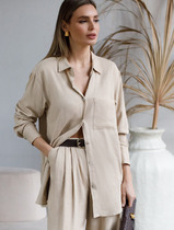 Блуза-рубашка со стояче отложным воротником и центральной застёжкой на петли и пуговицы. Перед с накладным карманом и декоративной деталью с застёжкой на пуговицу. Спинка с отрезной кокеткой и складкой от неё. Рукава втачные с манжетами по низу.