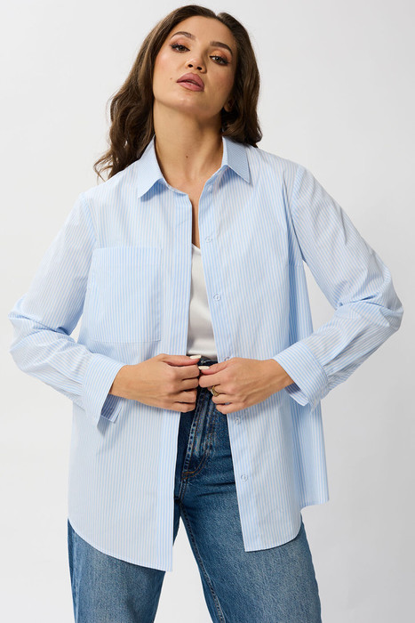 Блуза прямого силуэта с центральной потайной застежкой. Воротник стоячий отложной с отрезной стойкой. Перед с нагрудными вытачками и одним нагрудным карманом. Спинка с отрезной кокеткой и встречной складкой по центру от кокетки. Рукав втачной, одношовный, рубашечного типа. По низу рукава обработанный разрез, две складки и притачная манжета с застежкой на две пуговицы. У блузы фигурный низ.