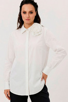 Блуза женская, прямого силуэта с потайной застежкой. Перед с нагрудными вытачками. Спинка с отрезной кокеткой. Воротник рубашечного типа, с отрезной стойкой. Рукав тачной, одношовный, с манжетой по низу. Низ фигурный. Декоративный цветок (съемный, пуговица)