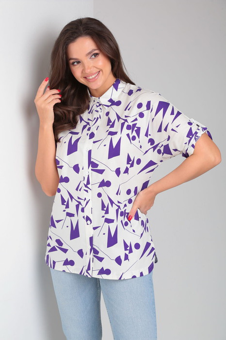 Элегантная рубашка из хлопковой ткани свободного силуэта с цельнокроеным рукавом и рубашечным воротником на стойке. Передние полочки  изделия с  центральной застёжкой на планку от воротника до низа на петли-пуговицы. Спинка со средним швом, по бокам закруглённые разрезы. Рукав короткий с патой   застёгивающейся на пуговицу.