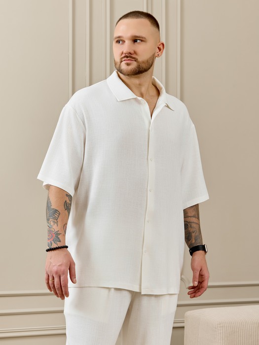 Рубашка мужская из фактурного полотна с втачными рукавами длиной до локтя, стояче-отложным воротником и центральной бортовой застежкой на петли и пуговицы. По воротнику и проймам настрочены отделочные строчки. Нижние срезы рукавов и изделия обработаны подгибкой.