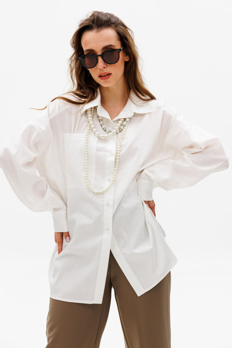 Рубашка прямого кроя объёма оверсайз со спущенной линией плеча с асимметричным бочком. Горловина обработана рубашечным воротником с отрезной стойкой. Застёжка центральная на петли и пуговицы. Есть нагрудный карман. Низ рукава обработан притачной манжетой, застёгивается на пуговицы.
