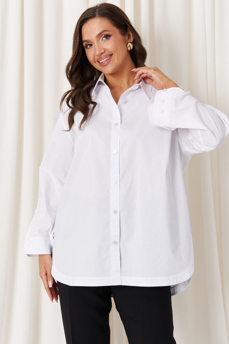 Особенностью дизайна является асимметричный крой: передний край блузки выполнен полукруглым и чуть короче спинки, создавая стильный и современный силуэт. Цвет блузки – белый, что делает её универсальной и легко сочетаемой с различными нарядами. Эта блузка станет отличным дополнением гардероба, сочетая комфорт с элегантностью и классикой.