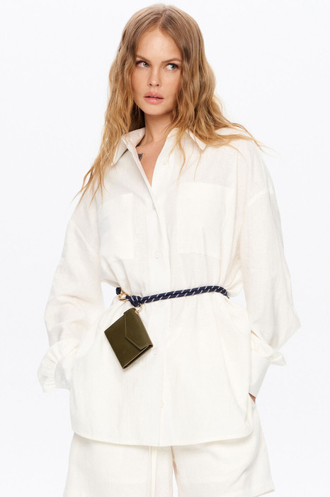 Детали: рубашка прямого силуэта, спущенная линия плеча, застежка на петли и пуговицы, длинные рукава с притачными манжетами, фигурный низ.