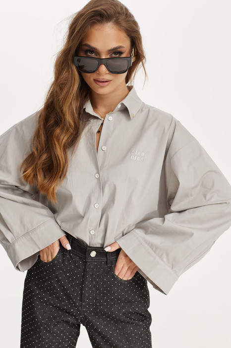Блузка из хлопковой ткани свободного кроя. Застежка по переду на кнопки. Воротник рубашечный.  На переде карманы. Рукав широкий с  манжетой понизу. Застежка  манжеты  на кнопку.