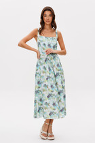 Сарафан женский полуприлегающего верху силуэта книзу прямой, на двойных широких бретелях, с V – образным вырезом по горловине спинке и перекрещенными бретелями, по боковым разрезы. Перед с нагрудными выточками. Спинка со средним швом.