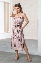 Сарафан силуэт трапеция. На спинке v вырез и люверсы, с игривыми завязками, которые подчеркивают женственность и изящество образа. Разрезы добавляют шарма образу, а также удобства.