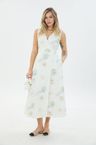 Сарафан женский выполнен из экокожи, изделие приталенного кроя, отрезное по линии талии. Сарафан на широких бретелях, по лифу изделия расположены отложные лацканы. Юбка трапециобразная , в боковых швах расположены карманы с клапаном. Сарафан двубортный с застежкой кнопки, в комплектации пояс из ткани основного изделия.