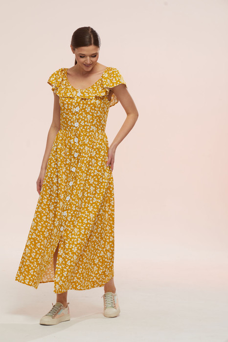 Летний, стильный, красивый сарафан без подкладки. Облегающий лиф и присборенная нижняя часть сарафана удачно контрастируют друг с другом. По переду лифа сарафана безпритачные бочки, спинка со средним швом и талевыми вытачками. По центру переда сарафана притачные планки на функциональную застёжку петли-пуговицы. По верху лифа сарафана волан-пелерина, переходящий от центра переда на плечи и спинку. На плечевом уровне настрочена эластичная тесьма-резинка, создающая эффект сборки. Пуговицы могут отличаться от заявленных на фото. В боковых швах нижней части сарафана боковые функциональные карманы. Горловина переда и спинки, проймы- обработаны обтачками. Шикарная посадка по фигуре. Длина сарафана от уровня линии талии – 90,5см. Цвет сарафана может отличаться на полутон от заявленного на фото.