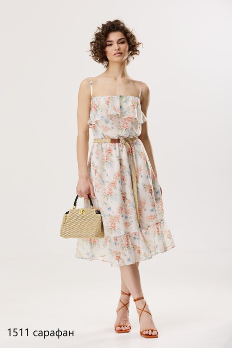 Изящный модный сарафан из итальянского шифона на бретелях. Модель свободной формы, по линии талии вставлена резинка, расширенное к низу. Сарафан отрезное чуть выше линии талии с двумя ярусами воланов. Пояс в комплекте.
