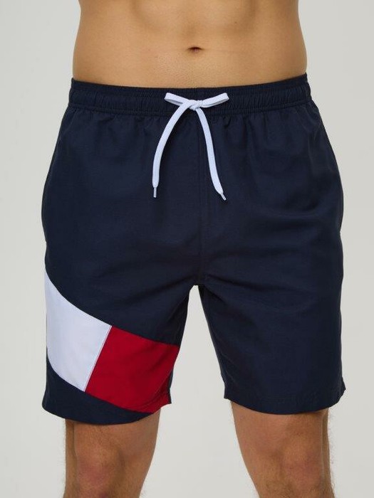 Мужские шорты с боковыми караманми из мягкого полотна без эластана. Контрасные вставки двух цветов на правой части шорт. Внутренние плавки из мягкой эластичной сетки. По линии талии широкая резинка и регулируемый шнурок. Подгиб по ни жнему краю шорт.
