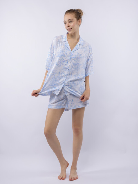 Домашний костюм из тканой вискозы состоит из рубашки и шорт. Принт : «Туаль де Жуи» (Toile de Jouy) — это французская ткань с одноцветным рисунком в синих тонах на светлом фоне, изображающим пасторальные сцены, пейзажи или сцены из жизни XVIII века. Рубашка с английским воротником, на пуговицах, с коротким рукавом. Короткие шорты на резинке. Подгиб и строчка по низу рукава и рубашки и низу брюк. XS-XS(170-84-90), S-S(170-88-94), M-M(170-92-98), L-L(170-96-102), XL-XL(170-100-106)