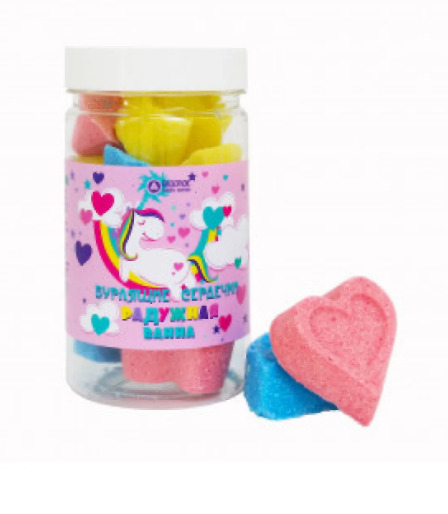 Бурлящие сердечки «Радужная ванна» - это возможность сделать свой приём ванны похожим на волшебную сказку. Натуральные масла, входящие в состав. ценятся за способность ухаживать за самой нежной и чувствительной кожей, увлажняя и питая её. Сочетание ароматов и цветов подарит хорошее настроение, может расслабить, успокоить и нормализовать сон.