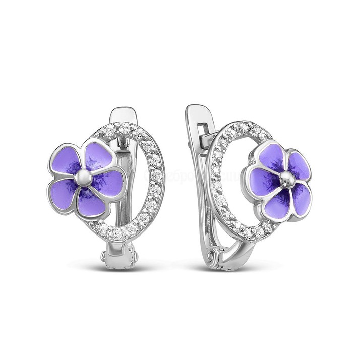 Серьги детские из родированного серебра с эмалью и фианитами - Фиалки 925 пробы
