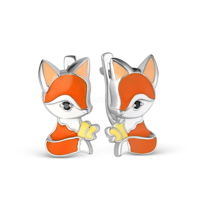 Серьги детские из серебра с эмалью и фианитами родированные - Лисы