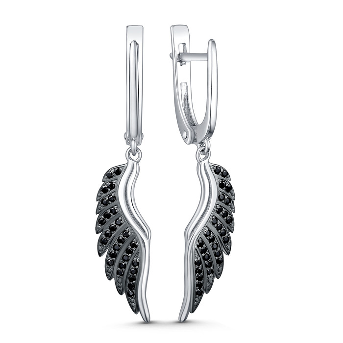 Серьги из серебра с натуральной чёрной шпинелью родированные - Крылья 925 пробы