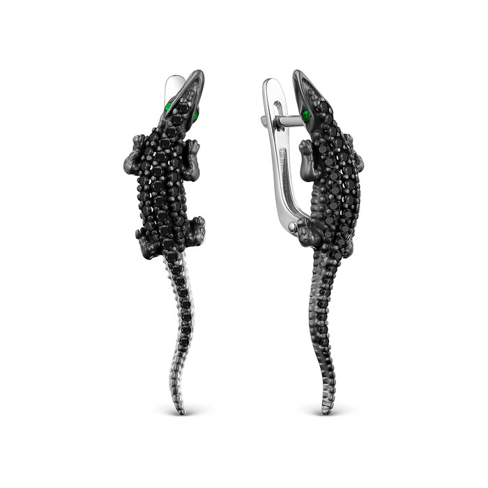 Серьги из серебра с зелёным агатом и шпинелью родированные - Крокодилы 925 пробы