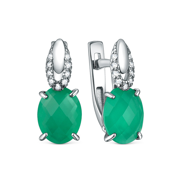Серьги из серебра сзелёным агатом фианитами родированные С-00050