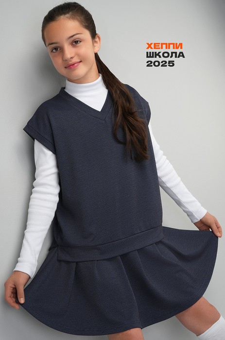 Жилет с V-вырезом и спущенным плечом гармонично сочетается с юбкой до колена, создавая лаконичный и практичный школьный образ. Синий костюм для девочки легко адаптируется под разные случаи — от повседневных уроков до торжественных мероприятий.