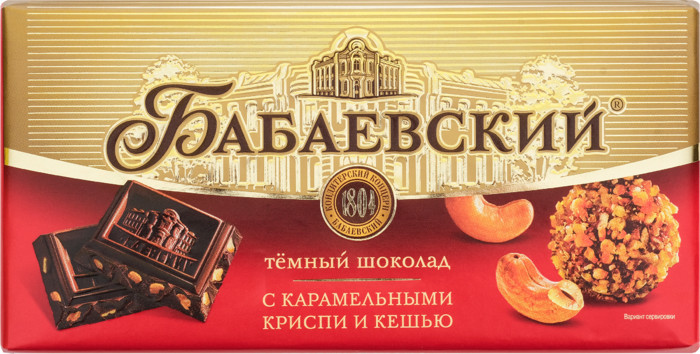 Тёмный шоколад "Бабаевский" с карамельными криспи и кешью - новинка, достойная вашего внимания! Хрустящая карамель с орехами кешью - это гармоничное, насыщенное сочетание вкуса и идеальное дополнение к дружескому чаепитию.