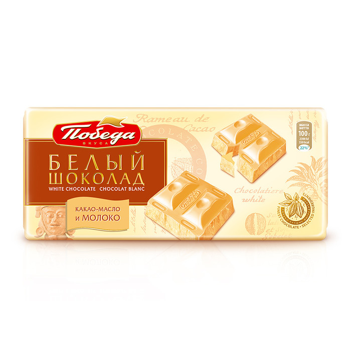 В отличие от других видов в состав белого шоколада добавляется только какао-масло без какао тертого, благодаря чему белый шоколад имеет такой нежный сливочный цвет. Кондитерская фабрика «Победа» придерживается европейского стандарта в рецептуре этого изысканного продукта – не менее 20 % какао-масла из Кот-д’ Ивуар, молоко и натуральная ваниль делают его вкус по-настоящему насыщенным и выразительным. Попробуйте: устоять невозможно!