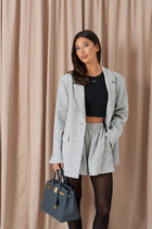 Шорты свободного кроя. Выполнены из фактурной ткани серого цвета со стразами и вкраплениями контрастной нити (чёрного цвета). С подкладкой. Пояс на резинке. В боковых швах карманы. Длина 38 см