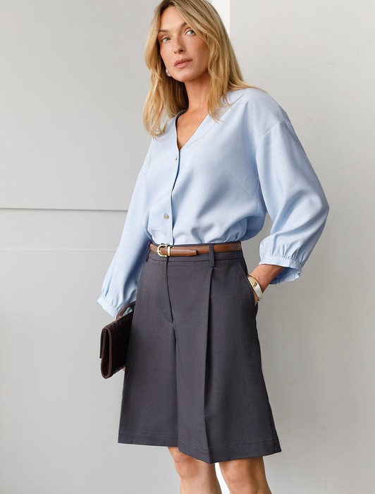 Состав: 65%ПЭ 33%Вис 2%ПУ Плотность: 250 Г/м2 Размер товара на первом фото: 42Шорты-бермуды выполнены из эластичной поливискозы. По верхнему краю спереди классически заложены складки, что придает свободы и простора в районе бедер. Свободный силуэт подходит для любой фигуры. Модель идеально впишется как в офисный дресс-код, так и в повседнвный аутфит.