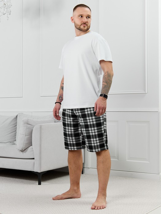 Шорты мужские из трикотажного полотна "кулирка" в клетку, свободного покроя, на притачном поясе с эластичной тесьмой внутри, с карманами в боковых швах. Нижние срезы обработаны подгибкой.