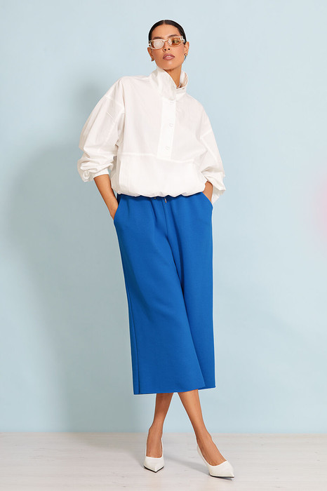 Шорты- бермуды выполнены из премиального трикотажного полотна. Шорты свободного кроя, длина ниже колена, пояс на резинке. Карманы в боковых швах. Сзади накладной карман. По поясу вставлен декоративный шнурок.