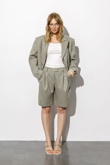 Шорты-бермуды с широкими складками из костюмной ткани «ёлочку» (приобрести жакет с фото можно по арт. 6723).