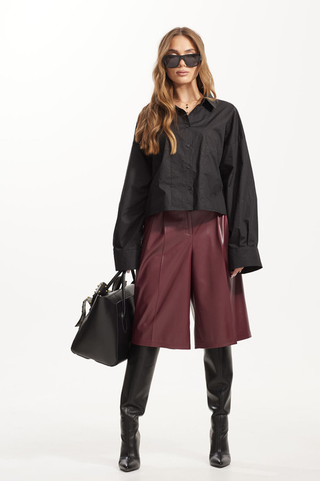 Бриджи удлиненные из экокожи. Верх на поясе со шлевками. По переду складки. Застежка по переду на молнию и пуговицу. В боковых швах карманы. Шорты на подкладке.
