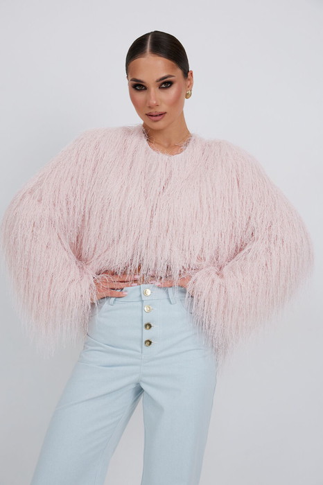 Жакет женский, из костюмно-плательной ткани с эффектом «травка», укороченный, прямого силуэта с центральной застежкой на три кнопки. Рукава длинные, слегка расширенные книзу, жакет на подкладке. Жакет прекрасно дополнит любой вечерний образ.