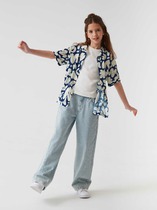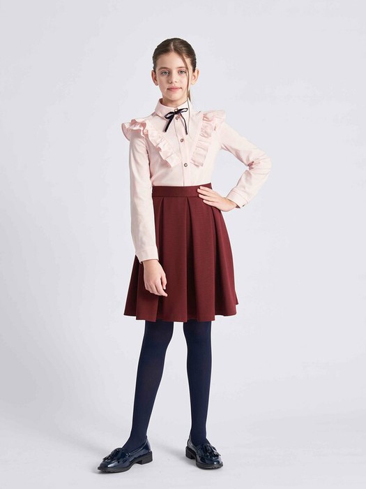 Эффектная блузка для девочки из смесового хлопка полуприлегающего силуэта с отложным воротником и длинными рукавами. Высокое содержание хлопка в составе обеспечивает отличную воздухопроницаемость и комфорт в повседневной носке. Полочка блузки и рукава декорированы оборками из основной ткани. Воротник дополнен небольшим бантом контрастного цвета из бархатной ленты. Центральная застёжка на планку с пуговицами, отличный вариант на каждый день.
