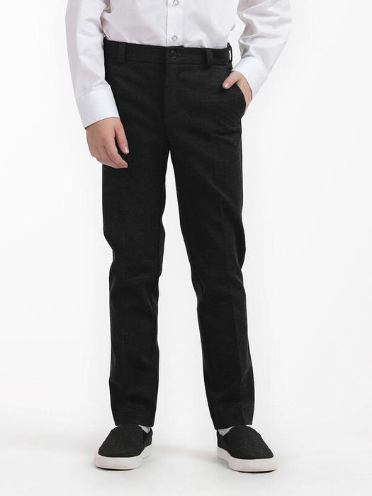 Брюки зауженные из трикотажа джерси для мальчика. Пояс с еврорезинкой сзади. На передней части брюк боковые карманы, горизонтальные защипы  и застёжка - гульфик на молнии. На правой задней половинке брюк - карман с узкой листочкой. Отличный вариант на каждый день.