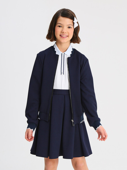 Трикотажный бомбер из смесовой вискозы с воротником-стойкой и длинными втачными рукавами с манжетами. Низ изделия собран на поясе. Бомбер дополнен боковыми прорезными карманами с листочкой и застегивается на металлическую молнию. Воротник, манжеты и пояс изготовлены из трикотажного подвяза с контрастным фестонным краем.  Эластичные волокна в составе обеспечивают комфорт в движении на протяжении всего дня.
