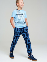 Брюки зауженные из трикотажа джерси для мальчика. Пояс с еврорезинкой сзади. На передней части брюк боковые карманы, горизонтальные защипы и застёжка - гульфик на молнии. На правой задней половинке брюк - карман с узкой листочкой. Отличный вариант на каждый день.