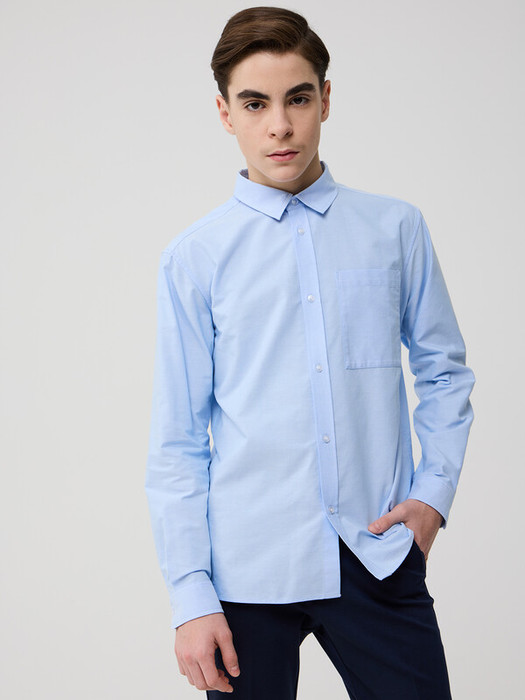 Сорочка для мальчика из смесового хлопка полуприлегающего силуэта. На спинке - кокетка. Воротник отложной со стойкой. Левая сторона полочки дополнена накладным карманом. Застёжка по центру переда на планку с кнопками. Рукава рубашечные со шлицами и манжетами.