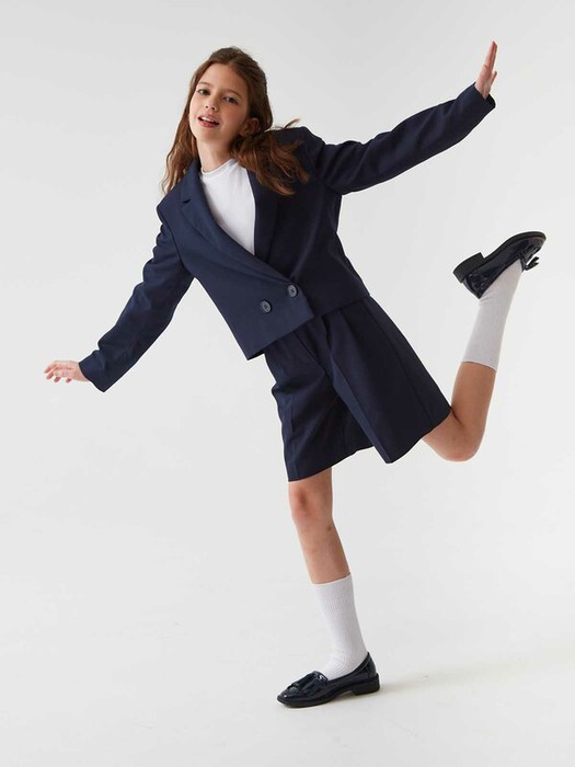 Укороченный жакет для девочек идеально подойдет для школы. Модель имеет двубортную застежку, что добавляет классический акцент и удобство в носке. Воротник выполнен в отложном стиле с лацканами , что подчеркивает аккуратность и элегантность внешнего вида. Дополнительное удобство обеспечивает подкладка, которая создает комфорт при ежедневной носке. На внутренней стороне правого борта предусмотрена потайная пуговица, что гарантирует надежность фиксации. Такой крой удачно впишется в школьный дресс-код, сочетая строгие линии с современным дизайном.