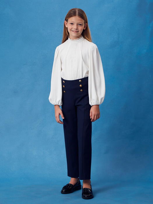 Прямые брюки для девочек изготовлены из немнущейся костюмной ткани высокого качества, которая идеально подходит для брюк данного фасона. Высокая талия и пояс на резинке не стесняют движений. Брюки имеют карманы достаточной глубины. Брюки элегантно смотрятся на девочках любого роста. Декорированы металлическими пуговицами.