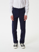 Прямые брюки для девочек изготовлены из немнущейся костюмной ткани высокого качества, которая идеально подходит для брюк данного фасона. Высокая талия и пояс на резинке не стесняют движений. Брюки имеют карманы достаточной глубины. Брюки элегантно смотрятся на девочках любого роста. Декорированы металлическими пуговицами.