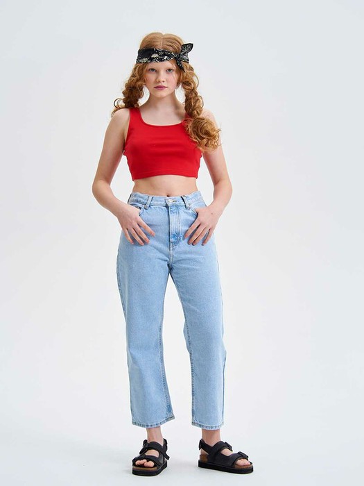 Стильные укороченные джинсы для девочки из качественного хлопка 12 унций, расклешеные к низу. Удобная застежка на пуговицу и молнию, внутри пояса дополнительная система   для регулировки размера. Модель имеет классический дизайн с пятью карманами и кокеткой сзади.