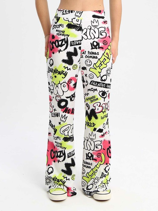 Брюки изготовлены из качественных материалов, обеспечивающих комфорт как в жару, так и в прохладную погоду. Они выполнены в стиле граффити с текстовыми надписями для создания трендового образа. Брюки легко стираются, быстро сохнут и не требуют особого ухода.
