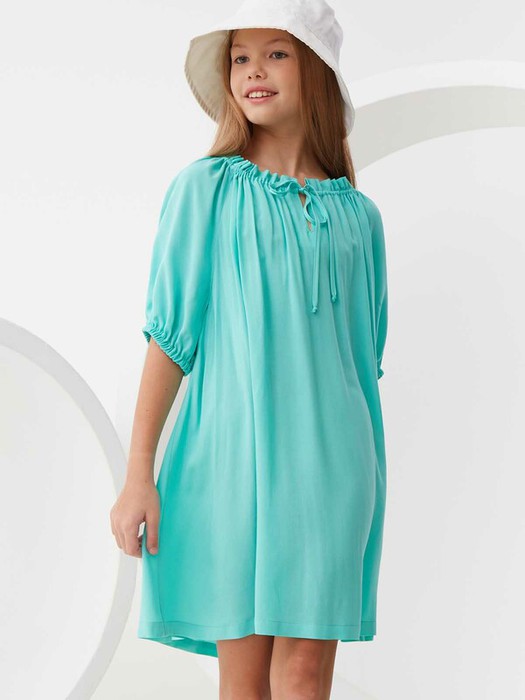 Платье летнее из 100% вискозной ткани. Платье без подкладки и без застежки. Силуэт платья расклешается книзу. По центру переда от горловины обработан разрез. Рукава короткие, покроя реглан. Низ рукавов вложена резинка. Вырез горловины широкий. В кулису вложена завязка из косой бейки из основной ткани,. Завязка присобирает горловину платья и завязывается на бант. Низ платья застрочен швом вподгибку с закрытым срезом. Размерный ряд 116-152 см.