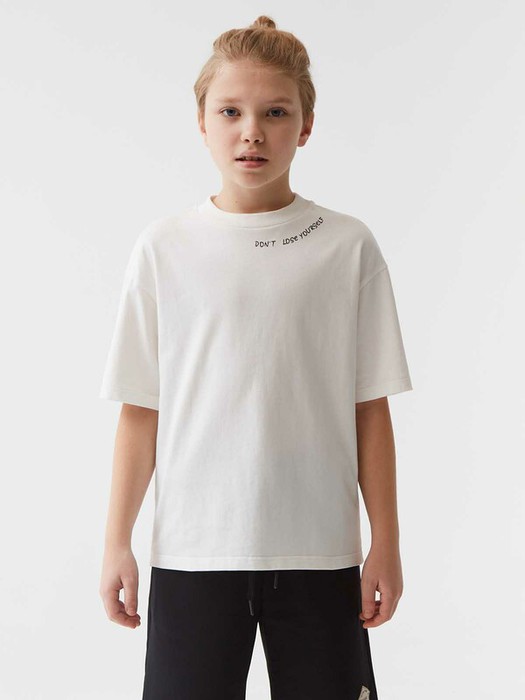 Футболка оверсайз силуэта с принтом DON`T LOSE YOURSELF (с англ. «не потерять себя»). Мягкий трикотаж из 100% хлопка. Свободный крой со спущенным плечом. Круглый вырез горловины и короткий рукав. Популярный крой оверсайз и спущенная линия плеч позволяет чувствовать себя свободно. Размерный ряд 116 – 176 см.
