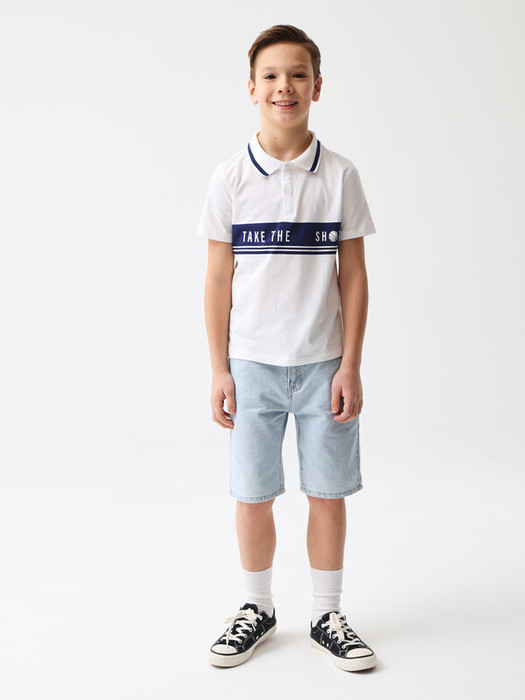 Трикотажное поло с короткими рукавами. Мягкий фактурный трикотаж из 100% хлопка. Классический прямой крой, отложной воротник, планка на двух пуговицах. В верхней части контрастный принт TAKE THE SHOT (с англ. «баскетбол сделай бросок»). Размерный ряд 128 – 176 см.