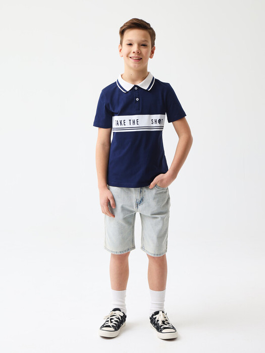 Трикотажное поло с короткими рукавами. Мягкий фактурный трикотаж из 100% хлопка. Классический прямой крой, отложной воротник, планка на двух пуговицах. В верхней части контрастный принт TAKE THE SHOT (с англ. «баскетбол сделай бросок»). Размерный ряд 128 – 176 см.